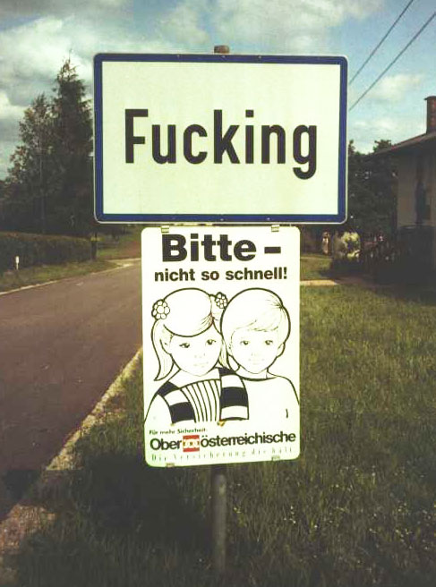 Und was glauben sie, wieviel Freude sie einem englischsprachigen Mitmenschen abringen können, wenn sie ihm das Ortsschild von Fucking in Oberösterreich zeigen... Ein vermutlich bereits sattsam bekanntes Beispiel: